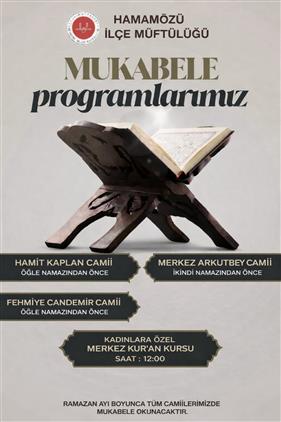 Mukabeleler; Merkez Kuran Kursunda (Kadınlara Yönelik) 17.02.2026 Salı Günü, Hamit KAPLAN Camiinde 18.02.2026 Çarşamba günü, Arkutbey ve Fehmiye CANDEMİR Camilerinde 19.02.2026 Perşembe günü başlayacaktır.