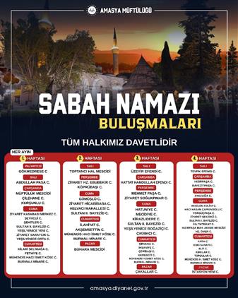 Amasya İl Müftülüğü tarafından, bereketli seher vaktinde camilerimizin manevî atmosferinde gerçekleştirilen ve Amasya’mızda gelenek hâline gelen Sabah Namazı Buluşmalarına tüm vatandaşlarımız davetlidir.
