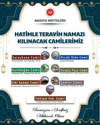 Mübarek Ramazan ayının manevi atmosferini en güzel şekilde idrak edebilmek amacıyla, Amasya’da bazı camilerimizde hatimle Teravih namazı kılınacaktır.
